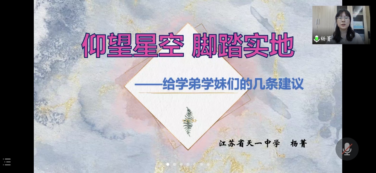 为做好2021年度的教育实习工作,提升思想政治教育专业学生的专业素养与教学水平,借鉴先进经验,深入把握中学教育实践现状,学院邀请江苏省天一中学政治教师杨菁老师于9月15日14时在腾讯会议开展题为“仰望星空,脚踏实地——中学政治教师的成长之路”的线上讲座。此次讲座由思政教研室主任王一成老师主持,2018级、2019级、2020级思政专业全体学生共同参与。