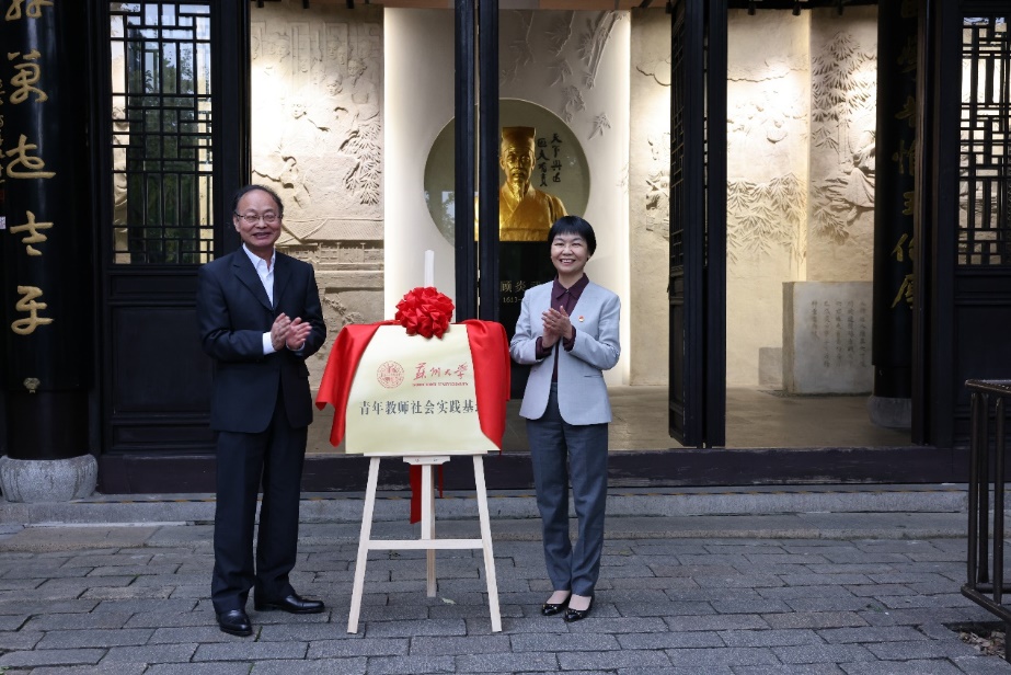 陈建林和林萍共同为调教漫画 青年教师社会实践基地揭牌。陈建林为在场青年教师代表赠书,并希望大家能够积极学习研究顾炎武思想,将“亭林精神”发扬传承,坚定文化自信。
