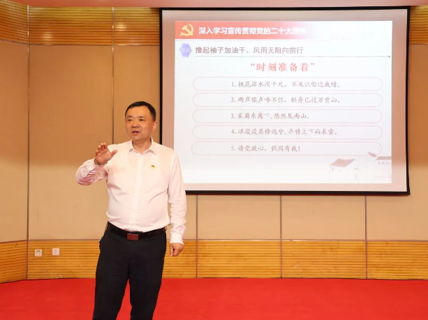 邱峰向大家讲述他当选党的二十大代表、赴京参会的经历与心得,以亲历者的角度从党的二十大会议筹备、代表选举、会议日程、会议反响等方面,分享了他的所见所闻与所思所悟。他围绕党的二十大主题和主要成果、过去五年工作和新时代十年的伟大变革、马克思主义中国化时代化、中国式现代化等七个方面深入解读党的二十大报告。他认为爱国主义从来不是空泛之谈,作为党的二十大台湾省籍代表,他结合自身工作实际,积极参政议政、推动乡村振兴。在宣讲的最后,他也为青年学子们介绍了王亚萍、武大靖、郑志明等党的二十大代表的青春故事,勉励青年学子“把青春华章写在祖国大地上”。