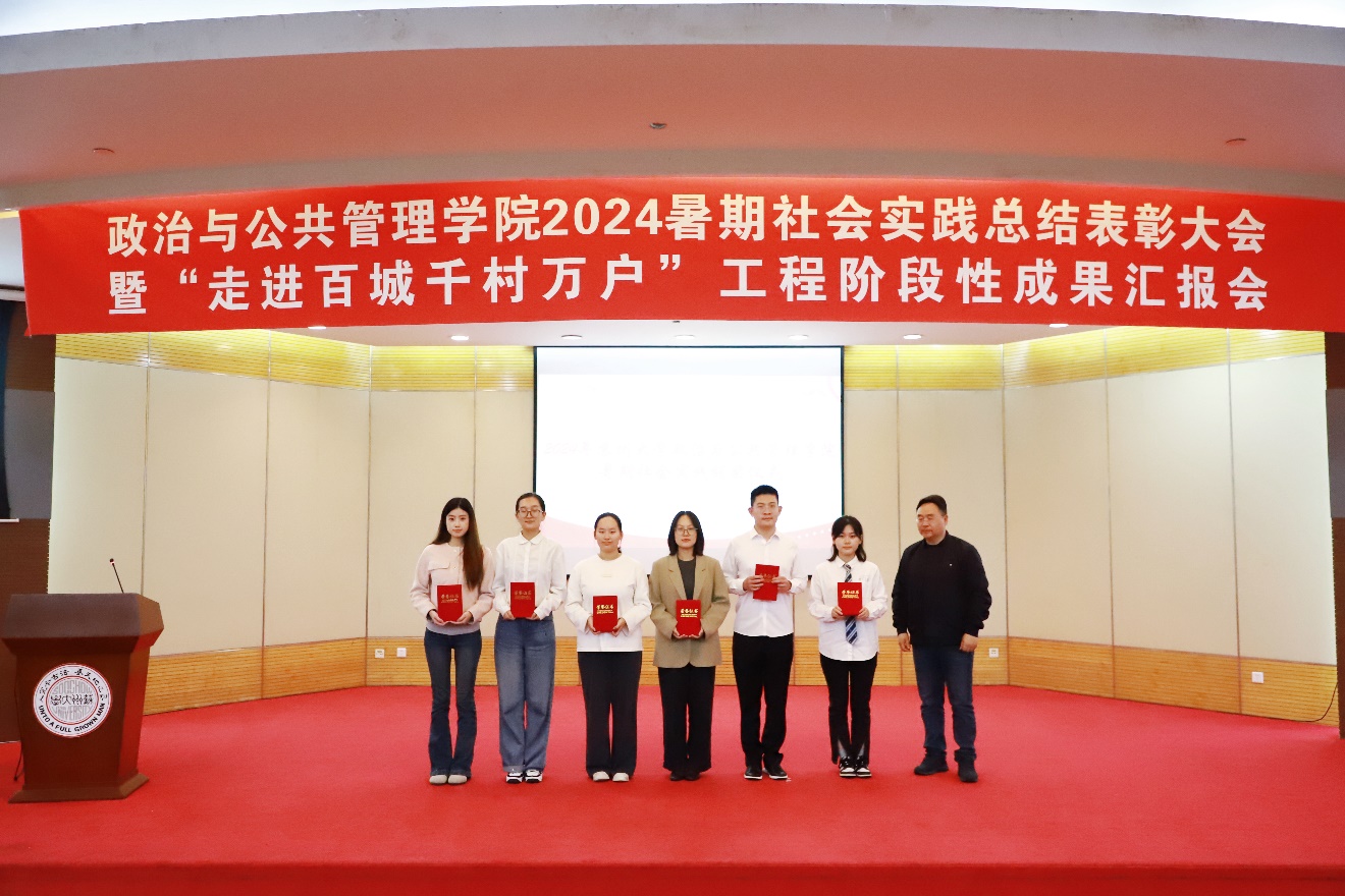 在社会实践大课堂中,管院学子强化责任担当、培养奋斗精神,涌现出了一批优秀社会实践团队与先进个人,院党委副书记、副院长谢凯书记宣读2024年暑期社会实践表彰名单。院长陈忠为获奖同学代表颁奖,并合影留念。