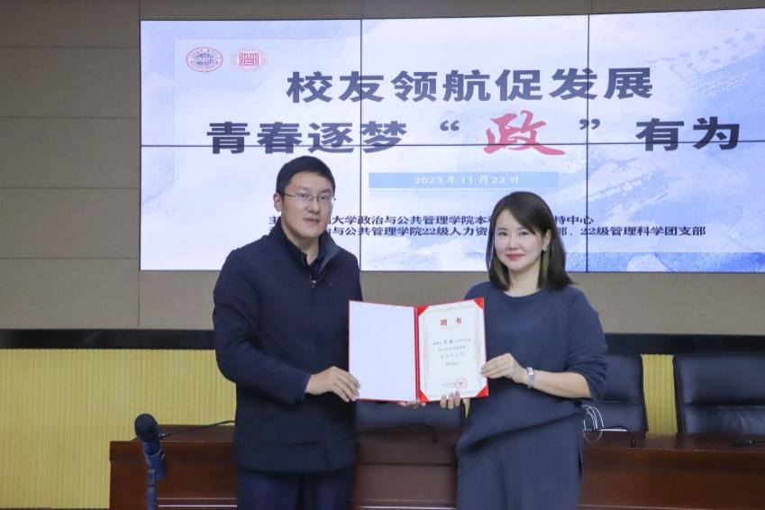 校友是学院“三全育人”队伍的重要力量,谢凯代表学院聘请贺燕为大学生创就业导师,并为其颁发聘书。
