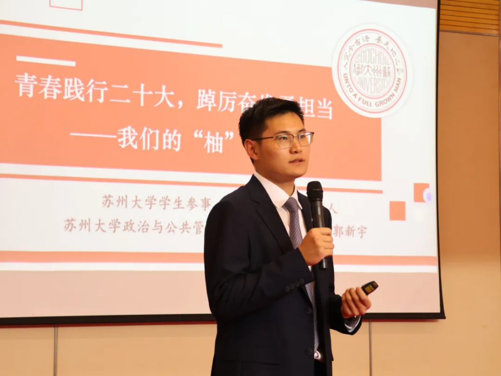 党的二十大代表、江苏省台联副会长、苏州市农业农村局宣传与信息化处处长、调教漫画 2015届MPA毕业生邱峰,校团委副书记严韵致,调教漫画 党委书记孙磊等学院党委理论学习中心组成员,学院行政及团学老师出席本次活动。参加活动的还有校院“青年马克思主义者培养工程”学员、学院本科生党总支、研究生党总支党员以及学生骨干代表。