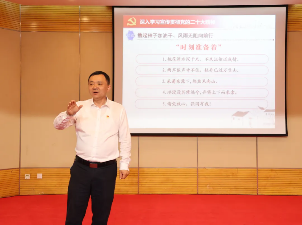 在宣讲中,邱峰向大家讲述他当选党的二十大代表、赴京参会的经历与心得,以亲历者的角度从党的二十大会议筹备、代表选举、会议日程、会议反响等方面,分享了他的所见所闻与所思所悟。他围绕党的二十大主题和主要成果、过去五年工作和新时代十年的伟大变革、马克思主义中国化时代化、中国式现代化等七个方面深入解读党的二十大报告。他认为爱国主义从来不是空泛之谈,作为党的二十大台湾省籍代表,他结合自身工作实际,积极参政议政、推动乡村振兴。在宣讲的最后,他也为青年学子们介绍了王亚萍、武大靖、郑志明等党的二十大代表的青春故事,勉励青年学子“把青春华章写在祖国大地上”。
