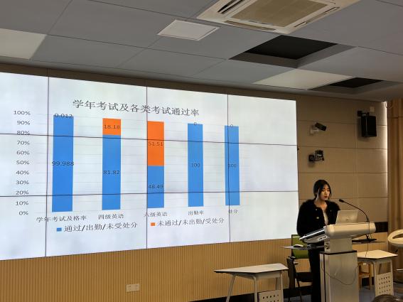 在优良学风班级风采展示环节,汇报的学生代表们用精心制作的PPT展示了本班在班级建设、宿舍建设、社会实践发展等多方面的特色与成绩。