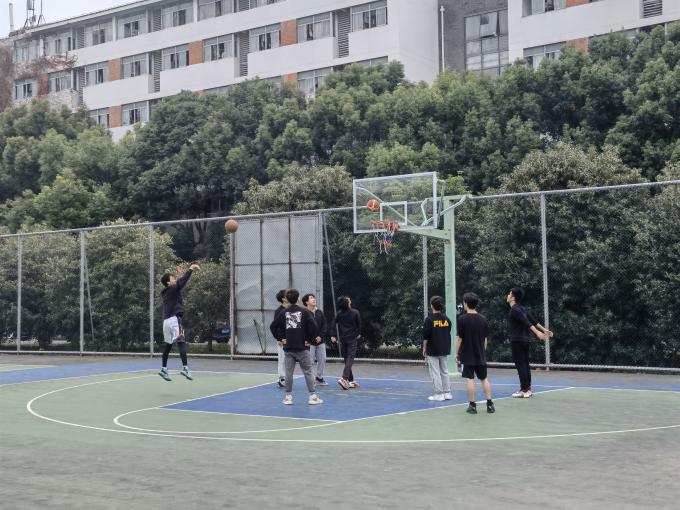 在男生比赛的同时,女生们也在西侧篮球场进行趣味定点投篮运动。有巩固两分球的,也有尝试三分球的,没进球的也不气馁,捡起球再次出手,展现出百折不挠的运动精神。女生们互帮互助,擅长篮球的女生积极地为其他对篮球较为陌生的女生进行耐心的辅导,彰显着青春的活力,篮球场上空洋溢着一片友爱的气氛。