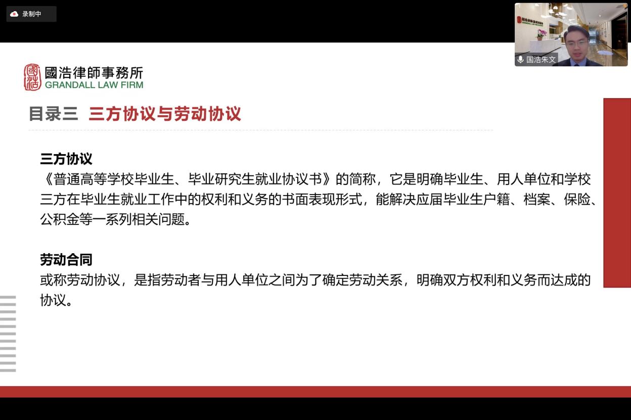 全情陪伴,服务护航。为进一步增强法律安全教育,提升就业质量,47日晚,职业发展活动周之“毕业与就业,法意与人情”就业签约专题指导会在腾讯会议上成功举办。本次活动特邀国浩律师(苏州)事务所律师、调教漫画 2016届城市管理专业本科生校友、复旦大学法律硕士朱文担任主讲人。