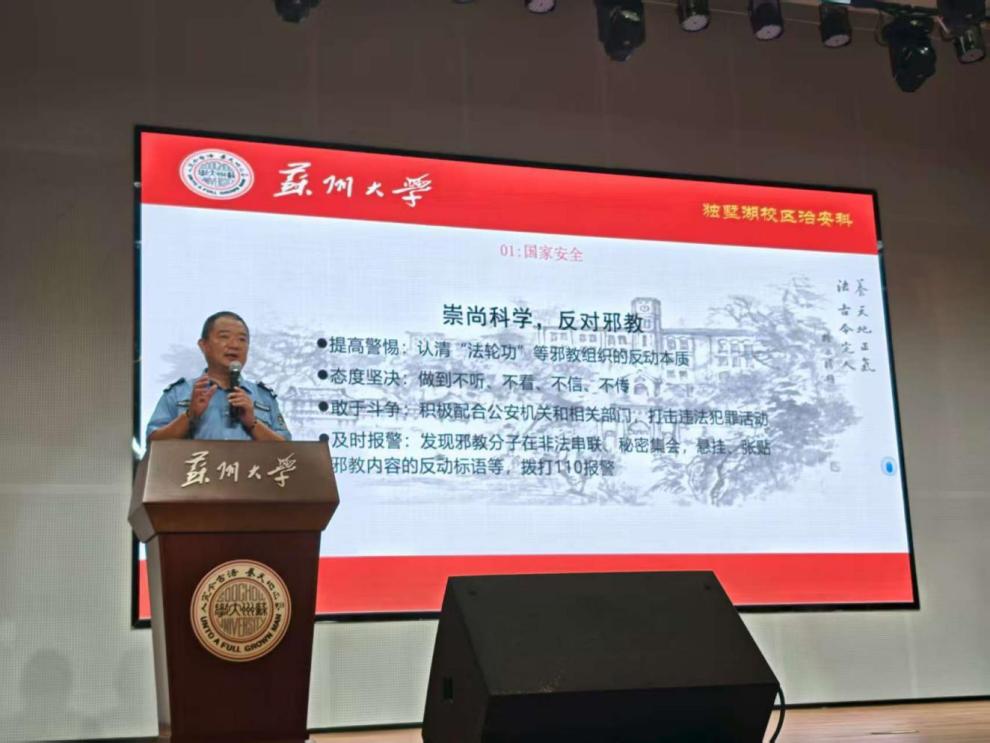 最后,保卫处独墅湖校区治安科芈志坚科长为新生们开展了安全教育专题宣讲。他结合校园真实案例,普及了火灾逃生技巧、游泳防溺水要点、网络安全与隐私保护、宿舍安全用电规范以及防范非法校园贷、自觉抵制“黄赌毒”等一系列安全知识,为初入校园的新生们筑牢了安全思想防线,也为他们顺利开启大学生活提供了坚实的安全保障。