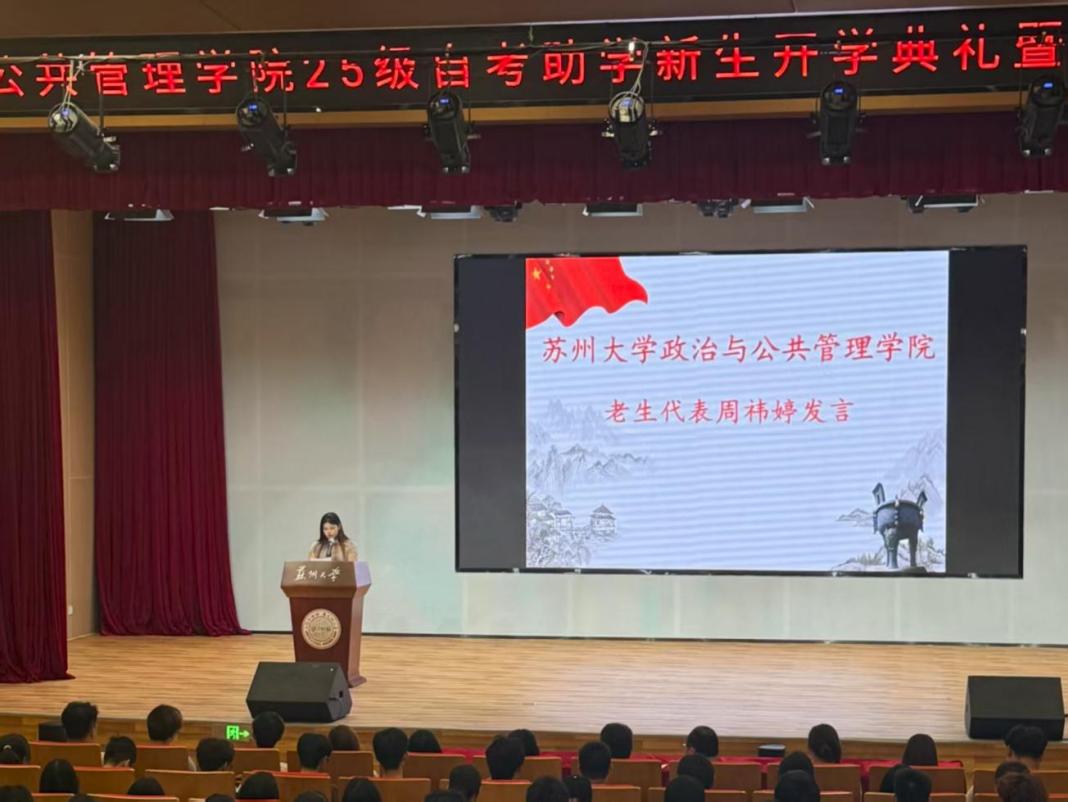 随后,新生代表胡杨同学登台发言,不仅彰显出成为苏大学子的骄傲, 更传递出对校园生活的热切期盼、对师长的诚挚敬意,以及在学业路上全力以赴的决心,引发了在场新生的强烈共鸣。