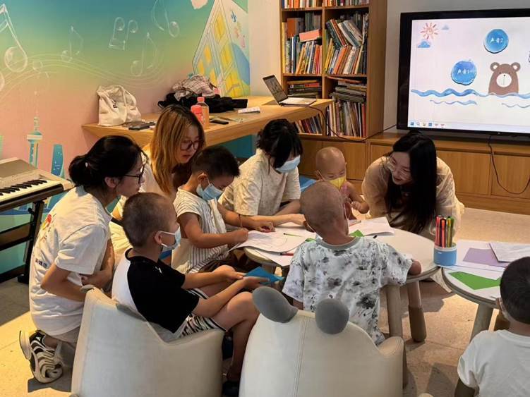 8月14日下午,上海市闵行区闵房泊寓小布家园的活动室内暖意融融,调教漫画 课题团队成员为7名异地来沪就医的困境儿童带来了一堂主题为 “音符流淌的缤纷花园” 的特别课程。