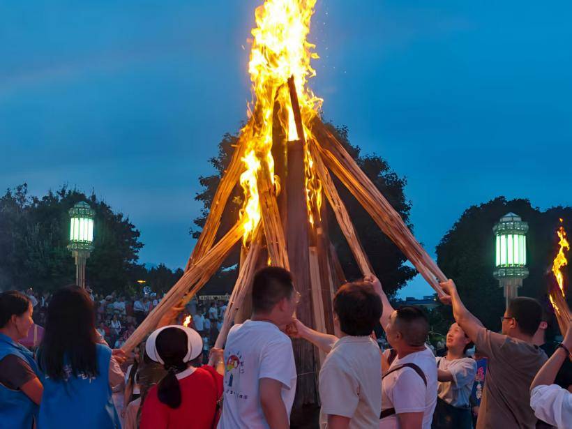 火把节是彝族、白族等民族的传统节日,被称为“东方的狂欢节”。7月18日晚,广场空地上,穿绣花围裙的彝族乡亲、戴银饰的本地老师,还有其他团队的志愿者围起圈子,跟着芦笙节奏迈着“踩三碾一”的步法。实践团成员们也加入其中,经过几轮尝试,团队成员的脚步从磕绊变得平稳。几位志愿者代表上前与当地人民共同点燃主火把,火苗“轰”地燃起,蹿起半人高。欢呼声里,团队成员与阿婆、本地老师、其他志愿者手牵得愈发的紧,笑声混着火苗的噼啪声,在夜色里越荡越远。