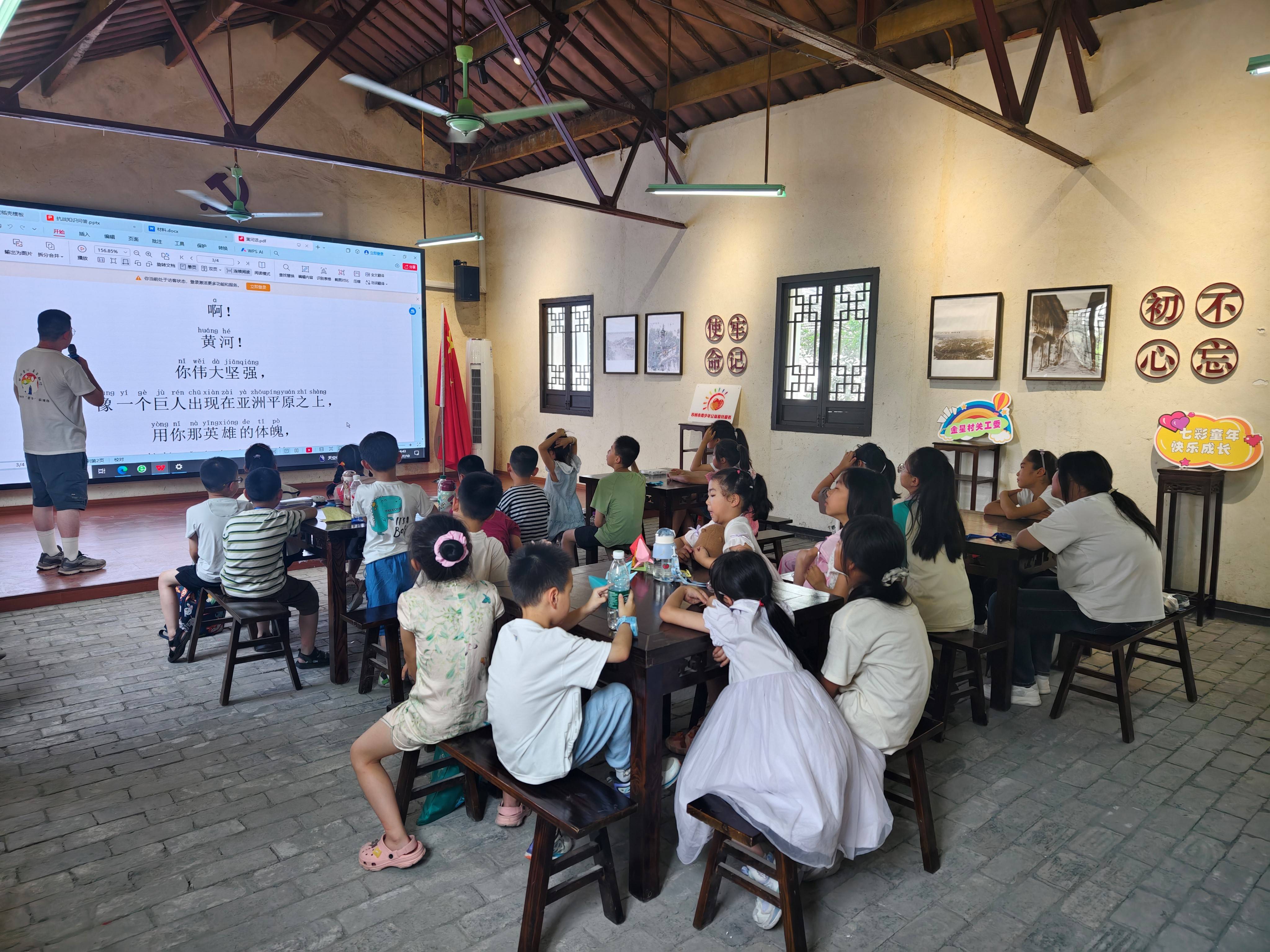 为纪念抗日战争胜利80周年,厚植青少年家国情怀,赓续红色文化血脉,7月16日上午,金星村、齐心村、众安桥村联合调教漫画 "哲学+"实践团,以"行走的哲思课"形式开展抗战主题教育实践活动。通过"诵读经典+光影思辨+艺术创想"三维课堂,将抗战精神转化为可触摸、可感知、可传承的生命体验,为乡村振兴注入"强国有我"的青春动能。