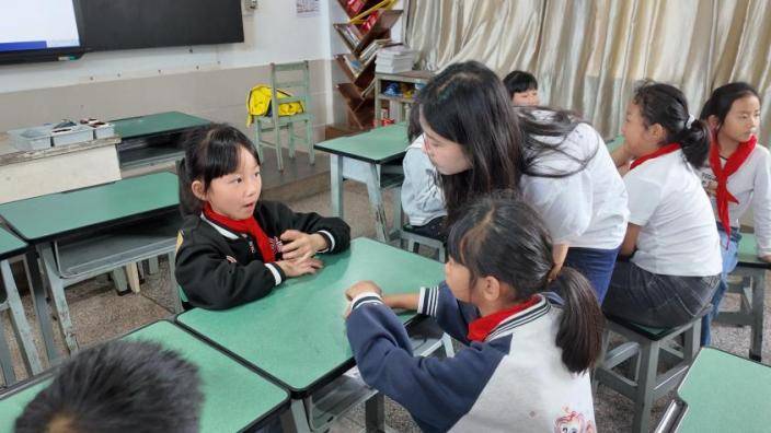 图8为团队成员周雨晨细心为孩子们答疑解惑 林山豪摄