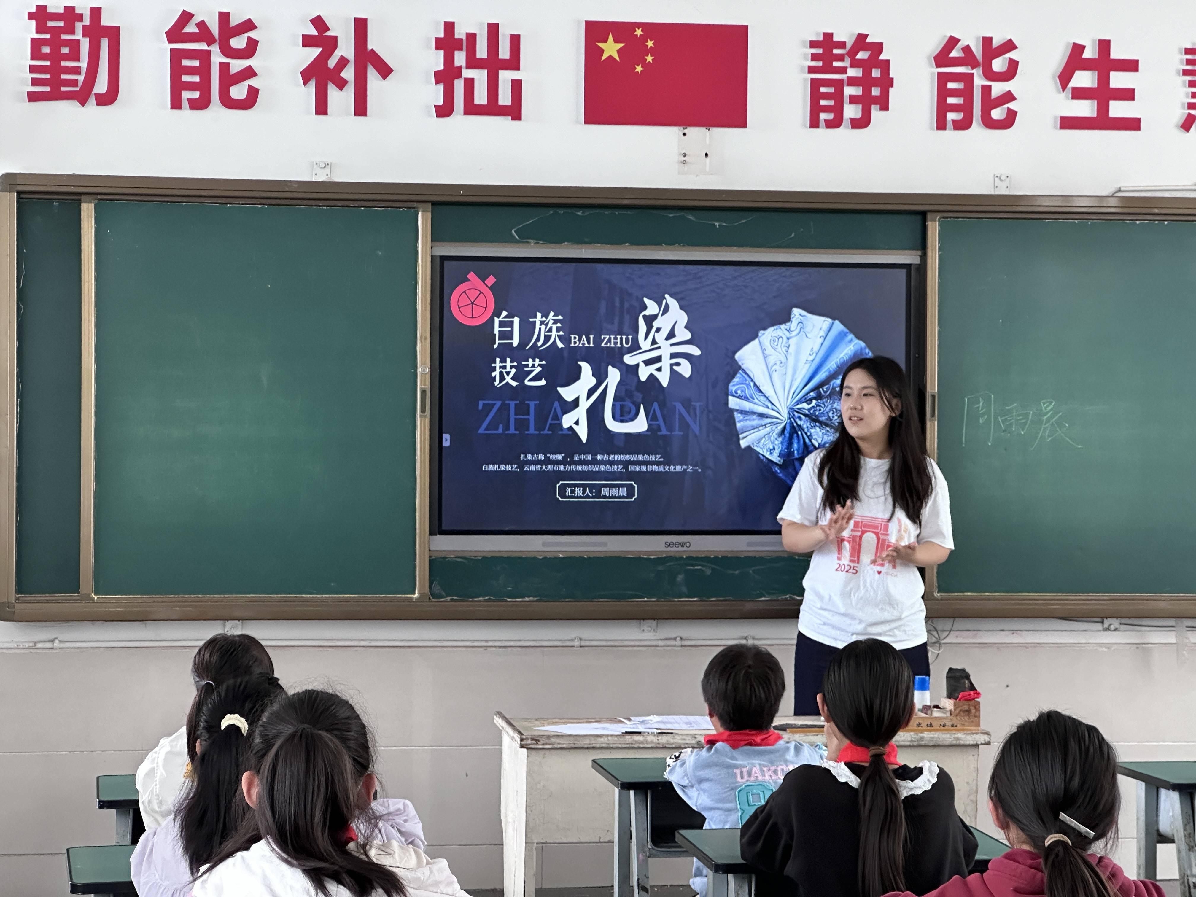 扎染课堂,同样惊喜满满!作为云南代表性非遗,团队成员从历史渊源讲起,孩子们知道了扎染古称“绞缬”,是云南白族代代相传的宝贵技艺,承载着当地山水、民俗与生活智慧,是云南民族文化的鲜活名片。