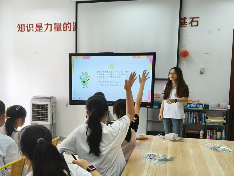 “怎么才能让孩子们喜欢听,听得进,记得住?”去往暑托班的路上,团队成员们还在交流探讨,如何将禁毒宣传与爱国教育有机结合,通过科普与游戏相结合的模式让孩子们筑牢禁毒防线。功夫不负有心人,课堂气氛热烈,孩子们积极参与、踊跃互动。实践团成员通过图文展示和动画短片介绍毒品种类与危害,以一问一答的方式当场考察学习成效,借助实物模具进行知识科普,在看一看、摸一摸、猜一猜中引导孩子们识别毒品原植物及伪装毒品。环环相扣,孩子们通过听、答、观、玩等方式把知识记住了,将情感升华了。