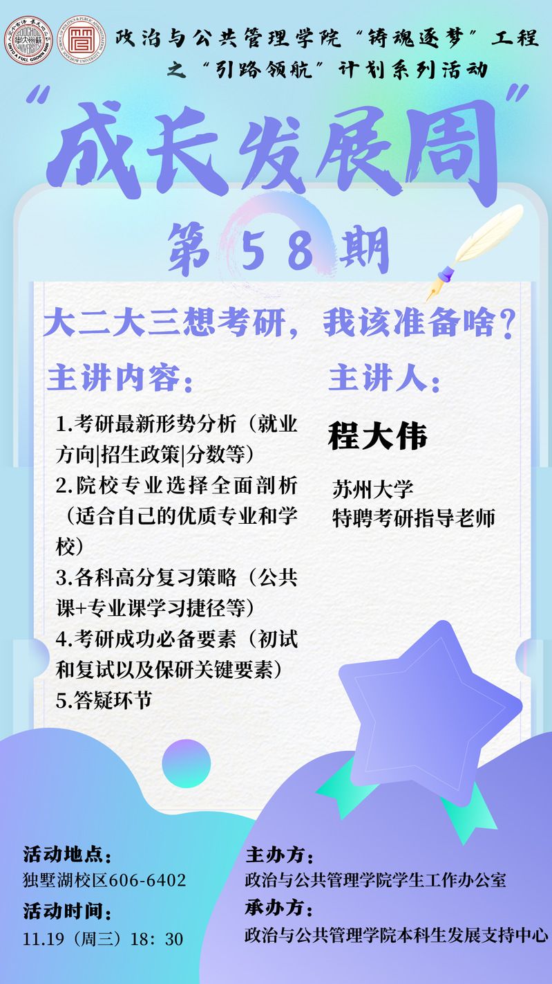 海报 | “铸魂逐梦”工程“引路领航”计划——成长发展周第58期《大二大三想考研,我该准备啥?》