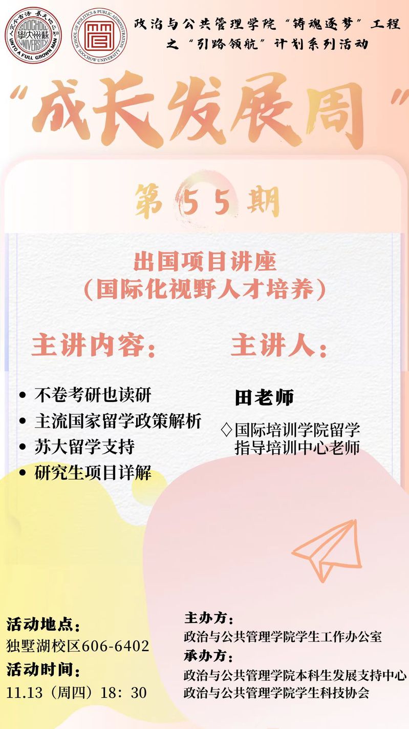 海报 | “铸魂逐梦”工程“引路领航”计划——成长发展周第55期《出国项目讲座》