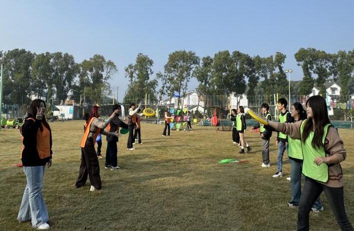 活动伊始,专业教练带领全体成员开展趣味破冰互动。随着分组完成,成员们身着黄、绿、橙、红四色队服,正式开启团队竞技环节。飞盘传递考验着队员间的反应速度与配合精度,一人抛接、众人掩护,每一次精准传递都伴随着阵阵欢呼;飞盘高尔夫则融合了技巧与策略,各队成员集思广益规划路线,在失误时相互鼓励,在得分时共同喝彩。无论是领先时的稳步推进,还是落后时的奋起直追,都展现出管院学子不骄不馁、团结奋进的精神风貌,团队默契在一次次协作中不断加深。