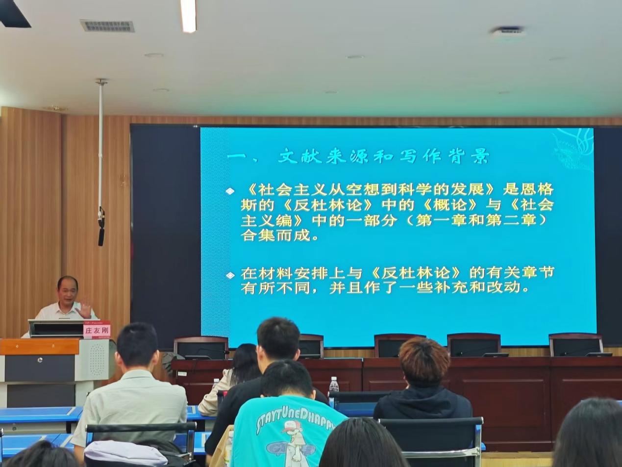 学院把牢为党育人的根本任务,引导学生通过读书强根铸魂。由学院教授推荐马克思主义经典著作作为全院学生的重点读物,引导学生通过原原本本读、逐字逐句读,理解和把握马克思主义理论的完整体系,理解和感悟中国共产党品质智慧,理解和把握中国成功密码,增强做中国人的志气、骨气、底气。“承经典薪火·启时代新思”读书会上,庄友刚教授以恩格斯经典著作《社会主义从空想到科学的发展》为研读范本,从19世纪欧洲工业革命后的社会矛盾、空想社会主义理论局限切入,系统梳理了该书的写作背景以及核心框架。在庄友刚教授的讲解下,同学们深刻认识到社会主义思想从空想到科学的演变过程,也更加深刻地理解了“两个必然”论断的历史必然性与现实指导性。