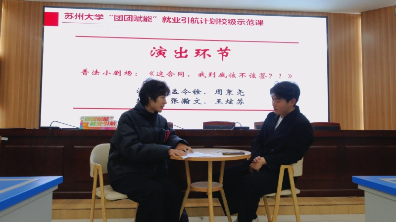 2025级新生周秉尧与孟令铨通过普法演出,以创意情景剧的形式带领大家走进AI时代的职场,沉浸式体验HR面试、劳动合同签订、就业实习等职场就业情景,帮助同学们提升就业方面的法律意识和权利维护能力。
