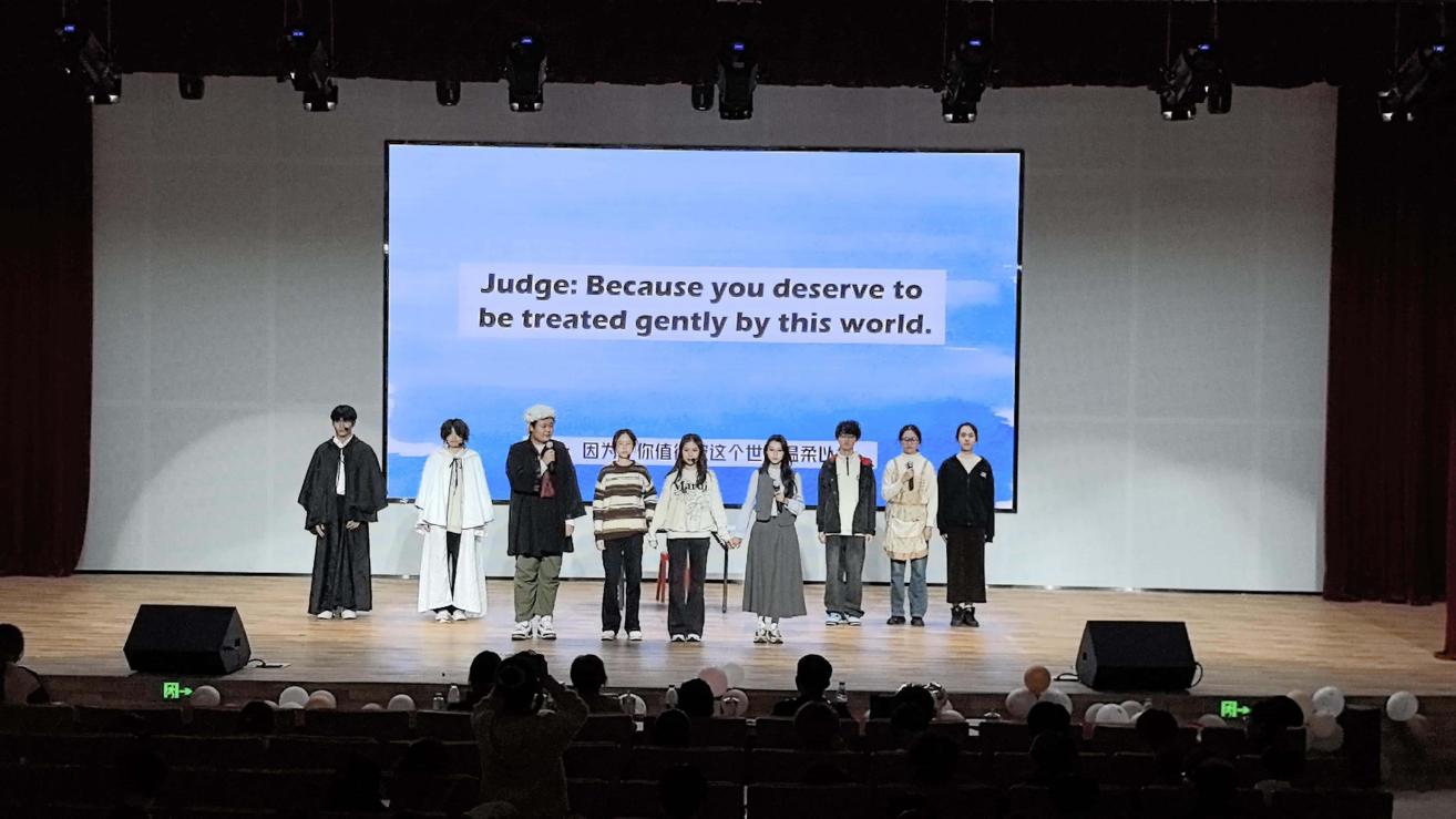 从剧组的第一次见面排练,到三院交流赛的默契配合,再到最终赛场上的璀璨绽放,“新英”之旅不仅是一场语言与戏剧的激情碰撞,更是一次关乎团结与协作的悄然成长。参与学生以汗水浇灌剧本的每一句台词,以匠心雕琢舞台的每一处细节。