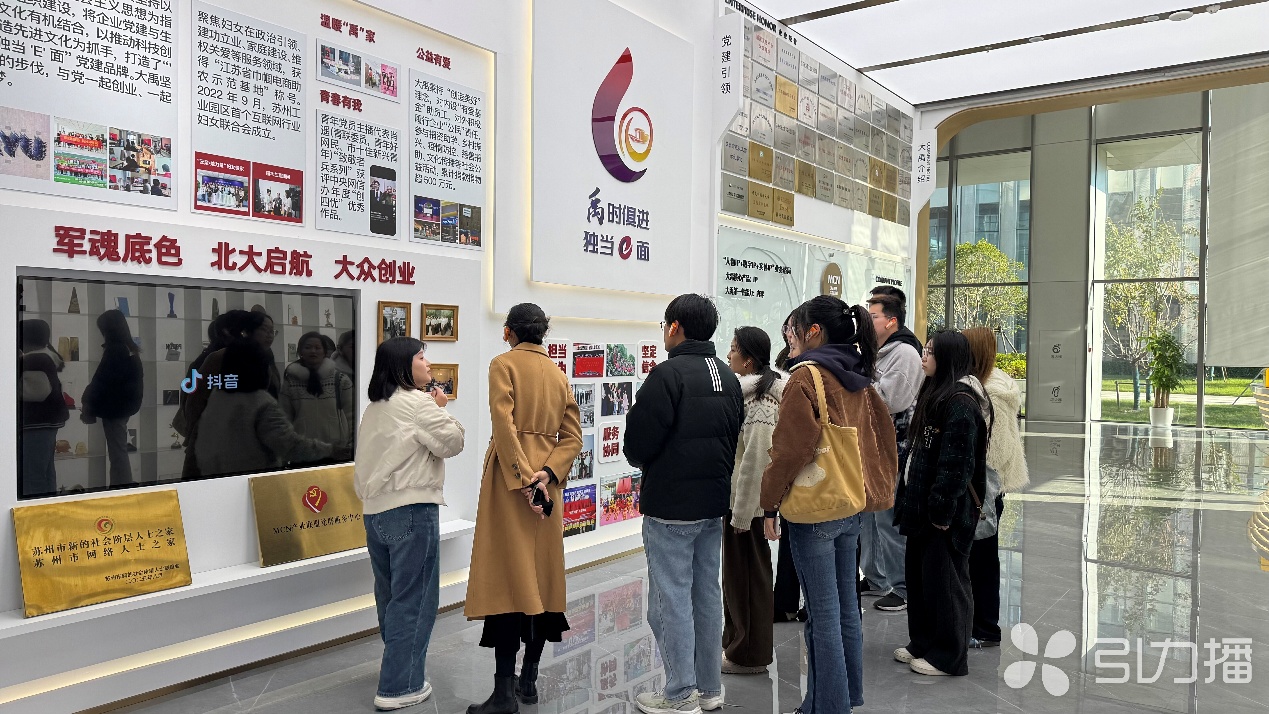 在大禹集团展厅,工作人员以“数字IP创造美好价值”为主题展开系统讲解,为学生们联动课堂理论与行业实践搭建桥梁。通讯员 斜塘萱/摄