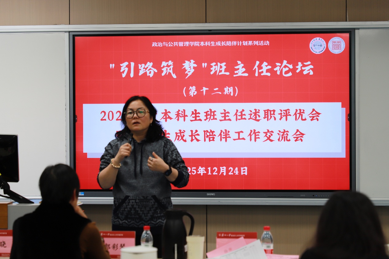 为深入推进本科生“铸魂逐梦”工程,进一步加强学工队伍建设,促进“成长陪伴”工作创新发展。12月24日下午,学院在606幢6217会议室召开2025年度班主任述职评优会暨本科生成长陪伴工作交流会。学院党委副书记、副院长李恩秀,学院党委委员郭彩琴、朱晓、吉文灿,各班班主任及全体辅导员参与了本次活动。活动由学院学工办主任董筱文主持。
