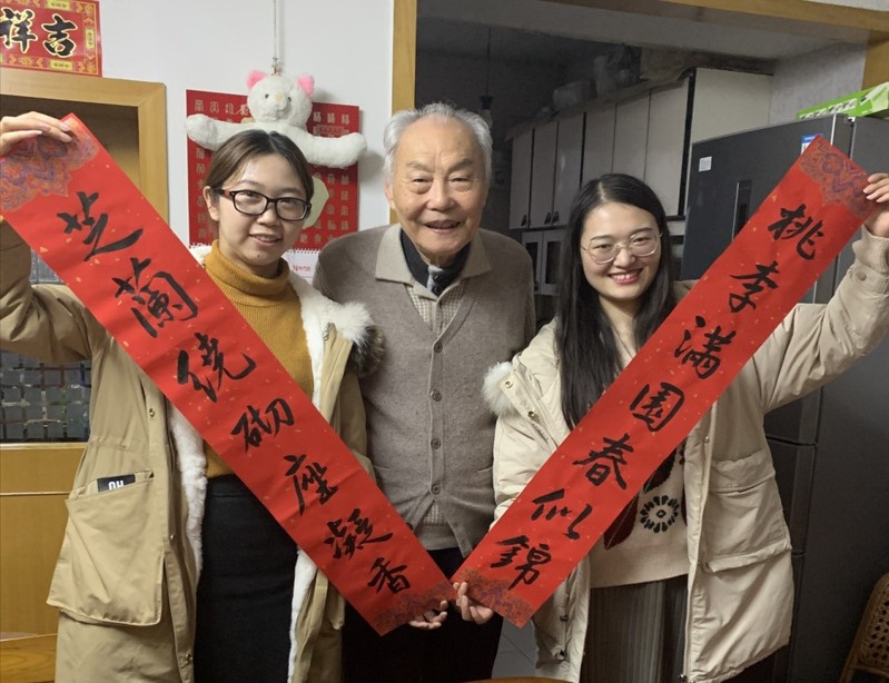 写完春联和福字,党员代表们携着春联和福字,分别前往退休老教师家中送祝福,受到了老教师们的热情欢迎。新老携手,桃符更迭,老教师与学生党员们一起张贴了刚写出来的春联和福字。祝福在新墨中传递,温暖在欢笑中荡漾。