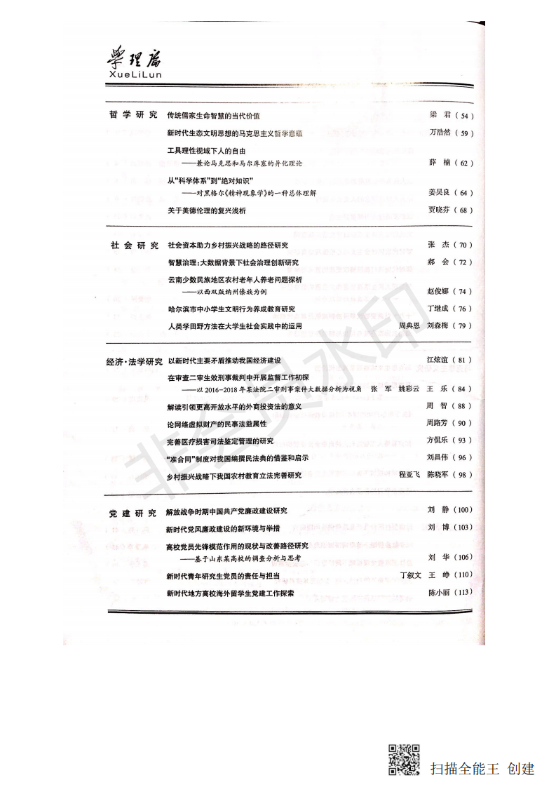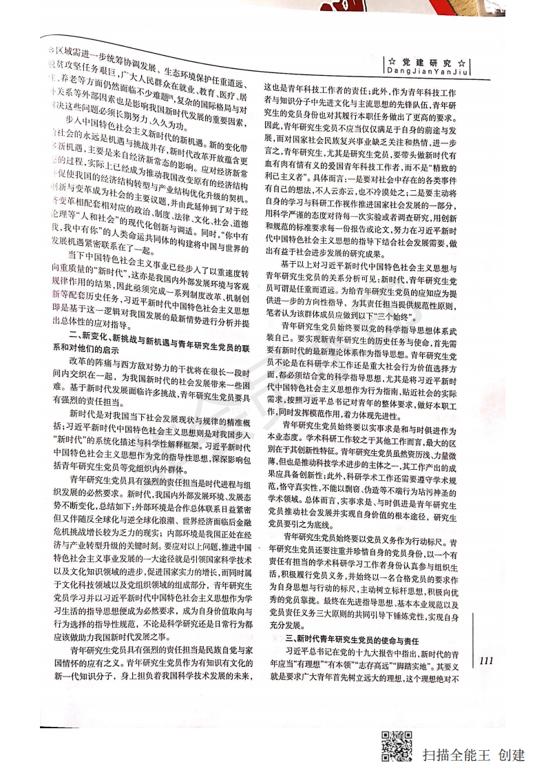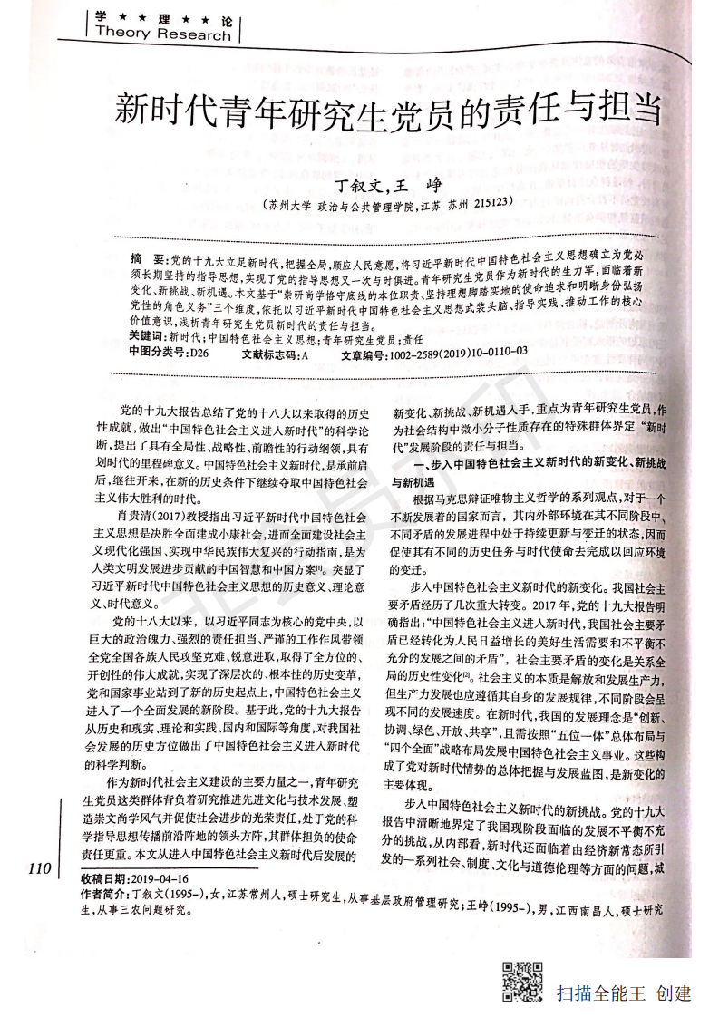 青年研究生党员作为新时代的生力军,面临着新变化,新挑战。中国特色社会主义理论体系研究会成员丁叙文和王峥同学共同撰写论文《新时代青年研究生党员的责任与担当》,文章基于“崇研尚学恪守底线的本位职责、坚持理想脚踏实地的使命追求和明晰身份弘扬党性的角色义务”三个维度,依托以习近平新时代中国特色社会主义思想武装头脑、指导实践、推动工作的核心价值意识,浅析青年研究生党员新时代的责任与担当。论文发表于《学理论》2019年10月刊版面。