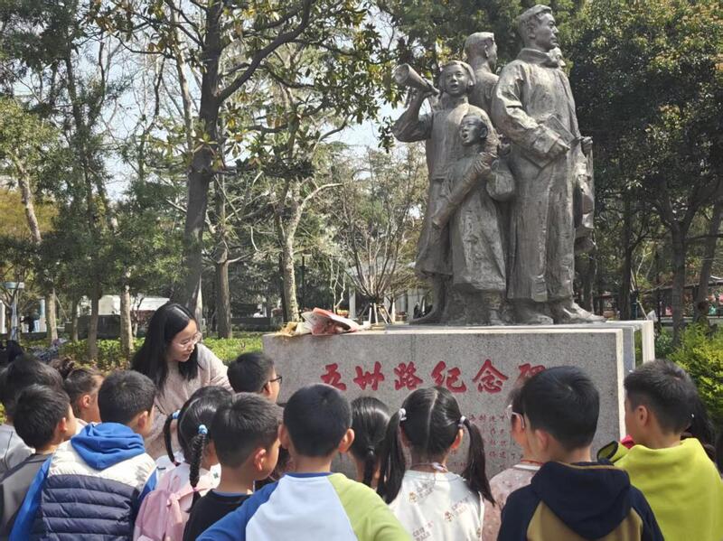“五卅路纪念碑”静静矗立在苍翠梧桐树下,碑身不高,无声诉说着一整段沉重的岁月。花岗岩的纹理里,刻着九十年前的风雨与呐喊。“五卅路是全国唯一一条以五卅命名的道路。”讲解员刘雅文同学讲述着1925年五卅运动爆发后,苏州人民以各种方式声援和支持上海人民的斗争。一位父亲俯身对孩子说:“这条路的名字,是用烈士的血换来的。”铭记是为了更好地前行,孩子们送上鲜花,驻足凝视,向英勇的革命先烈致以最深切的敬意,在心里暗下决心“成长,成才,做一个对国家和社会有用的人,绝不辜负先烈的热血牺牲。”