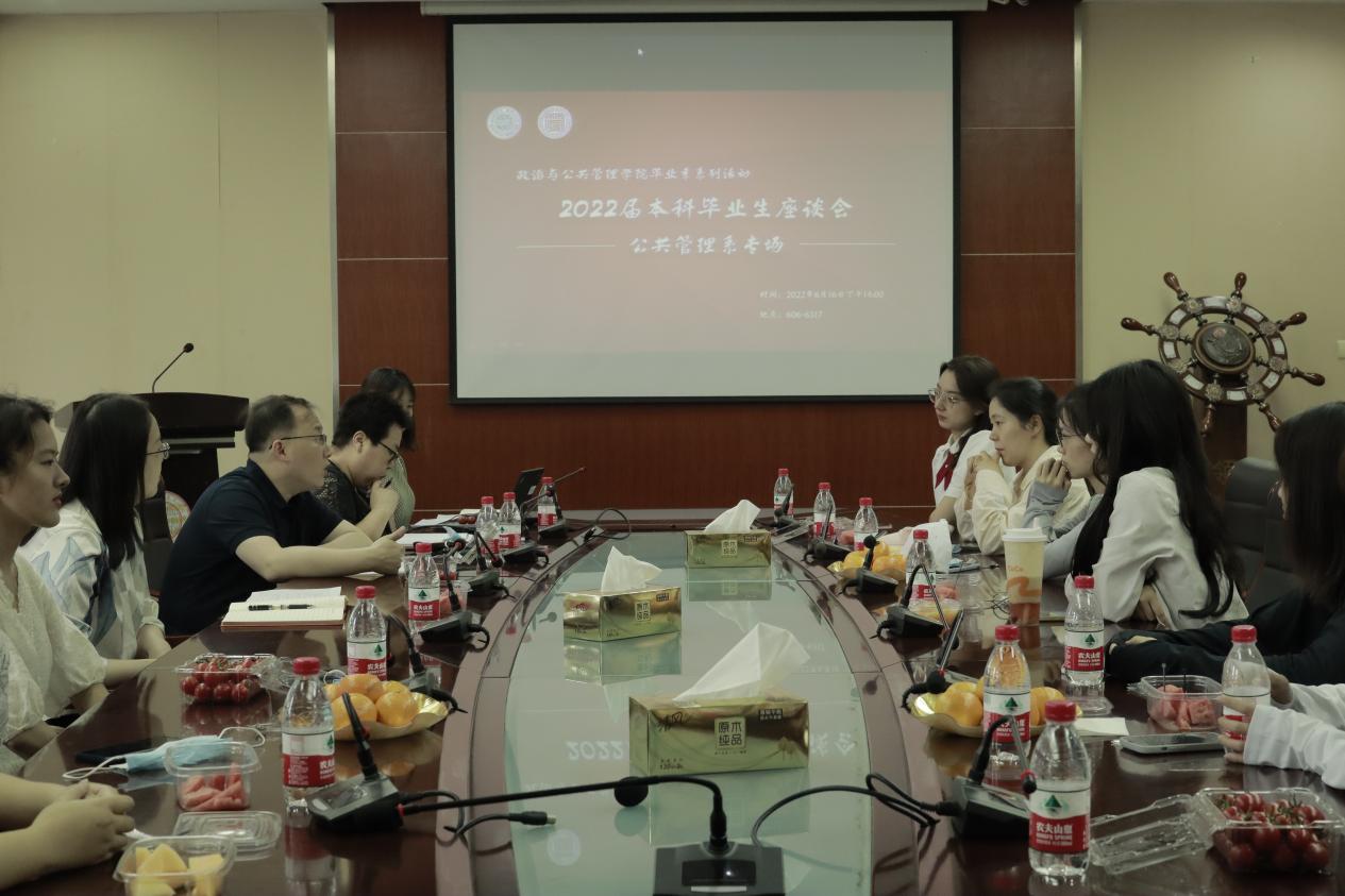 在606教学楼6317会议室召开2022届公共管理系本科毕业生专场座谈会。院党委副书记、副院长郝珺,公共管理系主任沈承诚,2018级公共事业管理班班主任车莲鸿,2018级本科生辅导员张凯丽及毕业生代表参加会议。