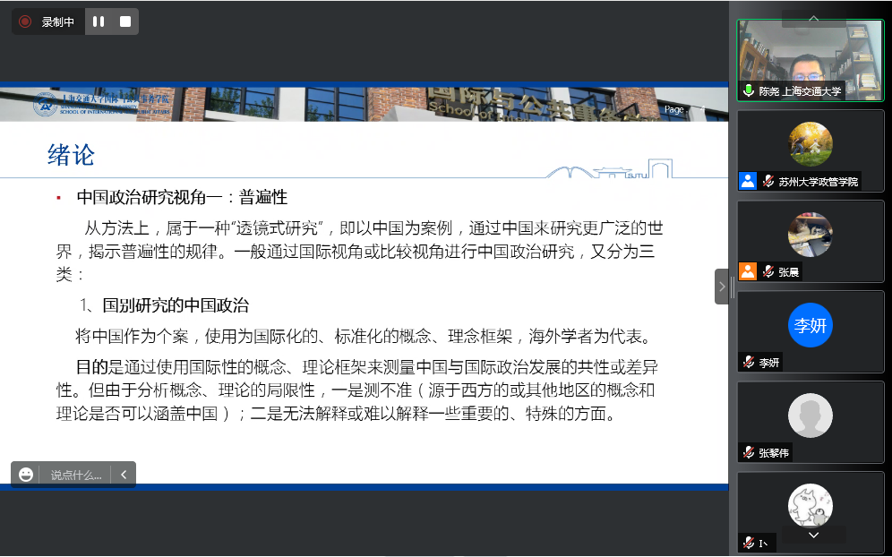2022年6月21日,调教漫画 主办的东吴政治学系列学术讲座在线上召开,上海交通大学国际与公共事务学院比较政治系的陈尧教授应邀出席并作“中国共产党治国理政中的政策治理与法律治理”讲座,本场讲座由调教漫画 政治科学系主任张晨教授主持。