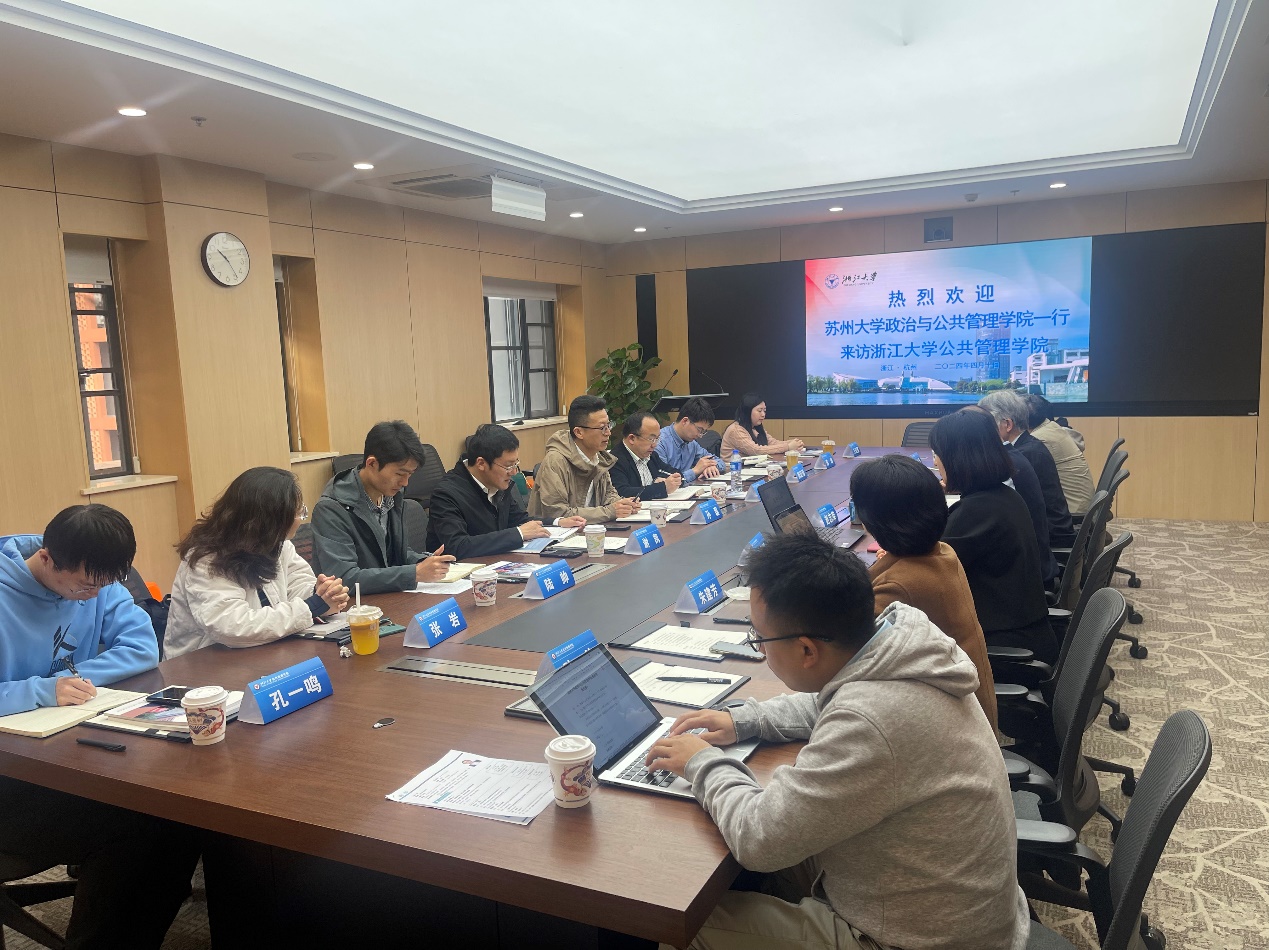 党委书记孙磊、副院长周义程、院党委副书记兼副院长谢凯、校人才引进办公室副主任颜廷锴、校学科建设办学科建设科陆帅以及青年教师王佳慧、张岩、陈琦、孔一鸣等前往浙江大学公共管理学院调研学习交流。浙江大学公共管理学院院长赵志荣、院党委副书记兼副院长钱文荣、党政办公室主任程思遥、组织与人事办公室主任朱建芳、研究生教学管理办公室主任邵明、党政办公室陈庚笙、辅导员栾永浩、博士后陈伟等参加了座谈会。