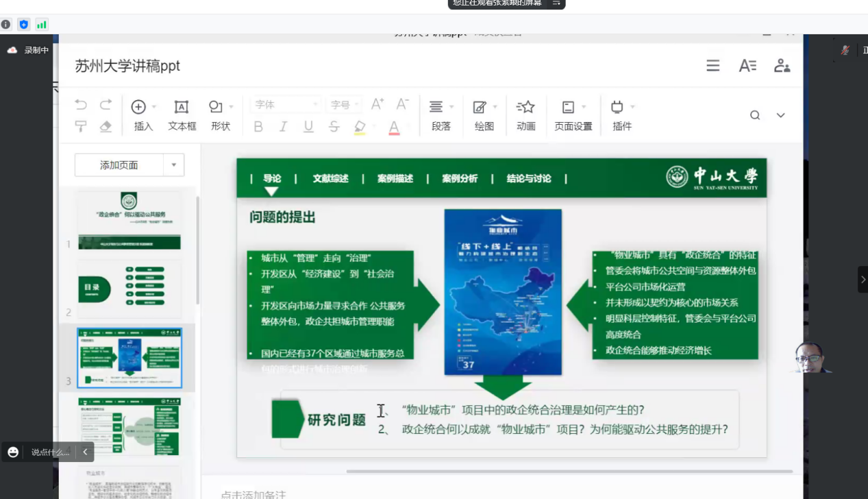 张紧跟教授以开发区公共服务治理中的政企统合为主题,从导论、文献综述、案例描述、案例分析、结论与讨论五个部分进行说明与探讨,对物业城市、政企统合等核心概念进行重点说明,张教授指出,开发区内的政企统合不是传统意义上面对经济发展的合作,而是面向公共服务领域的合作。
