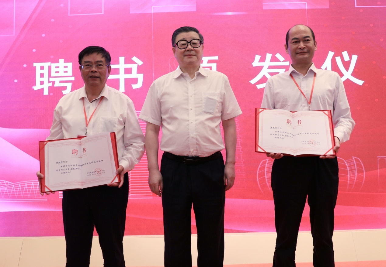 王伟光会长为两位分会会长庄友刚、陆树程颁发聘任证书并合影留念。