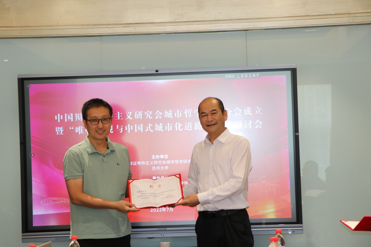 会议首先举行了中国辩证唯物主义学会城市哲学研究分会会长会议,城市哲学研究分会会长庄友刚教授就该会成立的宗旨、人员架构和工作内容等做了详细解读和说明。并为分会的副会长、秘书长和副秘书长分别版发了聘书并合影留念。