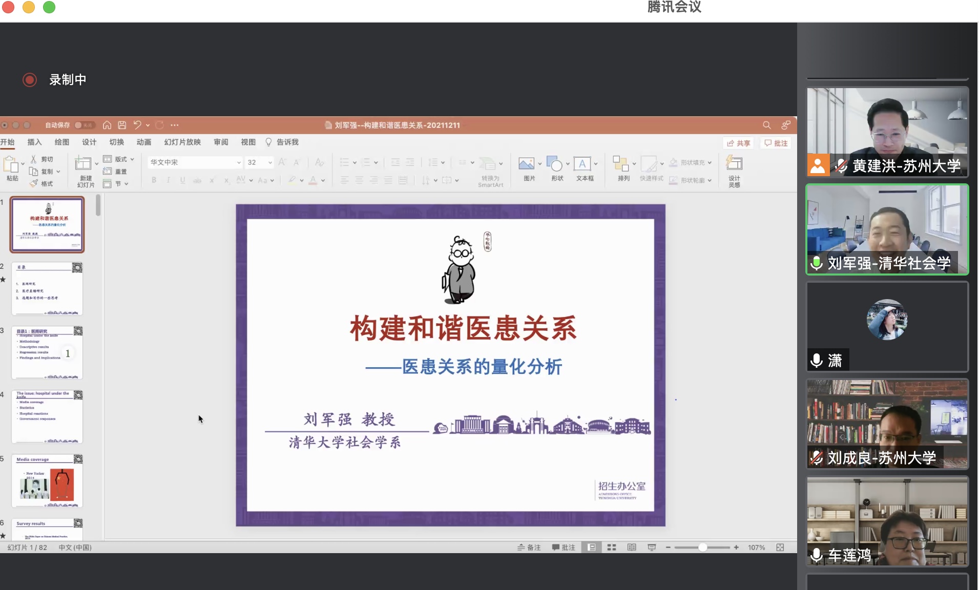 2022年10月21日上午,调教漫画 东吴公管系列讲座暨国家一流本科专业行政管理建设活动在线上召开。此次讲座的嘉宾为清华大学文科建设处副处长、社会科学学院刘军强教授,讲座主题是“构建和谐医患关系—医患关系的量化分析”。讲座由黄建洪教授主持,调教漫画 及兄弟院校师生近300人参与了此次讲座。