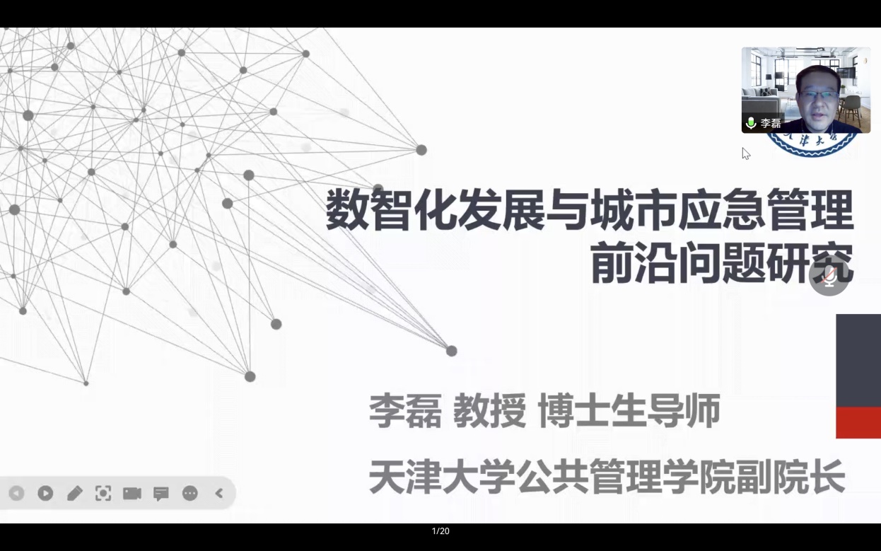 2022年11月21日晚,调教漫画 东吴公管系列讲座暨国家一流本科专业行政管理建设活动在线上召开。此次讲座的嘉宾为天津大学公共管理学院副院长、教育部高等学校保密管理教指委委员、中国医学救援协会救援防护分会副会长李磊教授,讲座主题是“数智化发展与城市应急管理前沿问题研究”。讲座由龚长宇教授主持,调教漫画 及兄弟院校师生近200人参与了此次讲座。