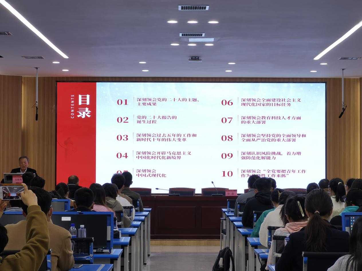 方教授从党的二十大报告诞生过程、过去五年的工作和新时代十年的伟大变革、开辟马克思主义中国化时代化新境界、中国式现代化、全面建设社会主义现代化国家的目标任务、教育科技人才方面的的重大部署、党的全面领导和全面从严治党的重大部署、风险挑战与着力增强防范化解能力、“全党要把青年工作作为战略性工作来抓”这十个方面,进行了全方位、宽领域、多层次的解读。方世南教授指出,要充分认识学习宣传贯彻党的二十大精神的重大意义,进一步深刻领悟“两个确立”的决定性意义,自觉用习近平新时代中国特色社会主义思想凝心铸魂,不断弘扬伟大建党精神,自信自强、守正创新、踔厉奋发、勇毅前行,为全面建设社会主义现代化国家、全面推进中华民族伟大复兴而团结奋斗。