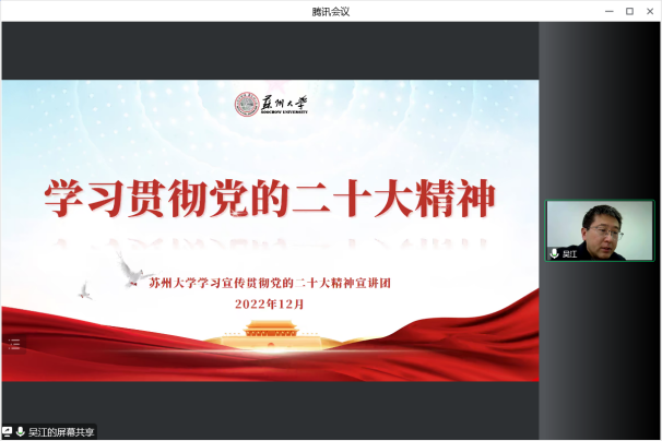 实践没有止境,理论创新也没有止境。吴江向党员们阐释了开辟马克思主义中国化时代化新境界、中国式现代化的深刻内涵和重要意义。他认为,学习领会习近平新时代中国特色社会主义思想,必须把十个明确、十四个坚持、十三个方面成就,联系起来学,贯通起来学,准确把握其基本观点、核心要义、科学体系、根本要求,深刻感悟党的创新理论的思想伟力和实践伟力,不断增强贯彻落实的自觉性和坚定性。接着,吴江聚焦全面建设社会主义现代化国家的目标任务、教育科技人才方面的重大部署、坚持党的全面领导和全面从严治党的重大部署、认识风险挑战和着力增强防范化解能力等重大理论和实践问题,对党的二十大精神进行系统宣讲和深入解读。其中,他重点阐释了二十大报告中关于“全党要把青年工作作为战略性工作来抓”的论断,再次强调,“青年工作直接关系中国特色社会主义事业后继有人、兴旺发达;重视青年工作是我们党的宝贵经验和优良传统;解决好新时代青年面临的问题意义重大而深远”。